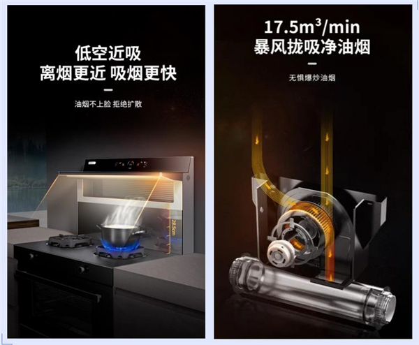 億田D6ZK蒸烤炸集成灶,構建黃金控煙區,在油煙擴散前凈吸,99.95%超高油煙吸凈率,油煙不上臉。更裝載具有暴風攏吸效果的下置風機,達到17.5m3/min,爆炒不跑煙。還你真正健康舒心的烹飪環境!