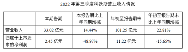 其中,2022年第三季度實現營業收入33.02億元,同比增加14.44%,實現歸母凈利潤2.45億元,同比下滑48.94%,實現扣非歸母凈利潤2.65億元,同比下滑33.71%。