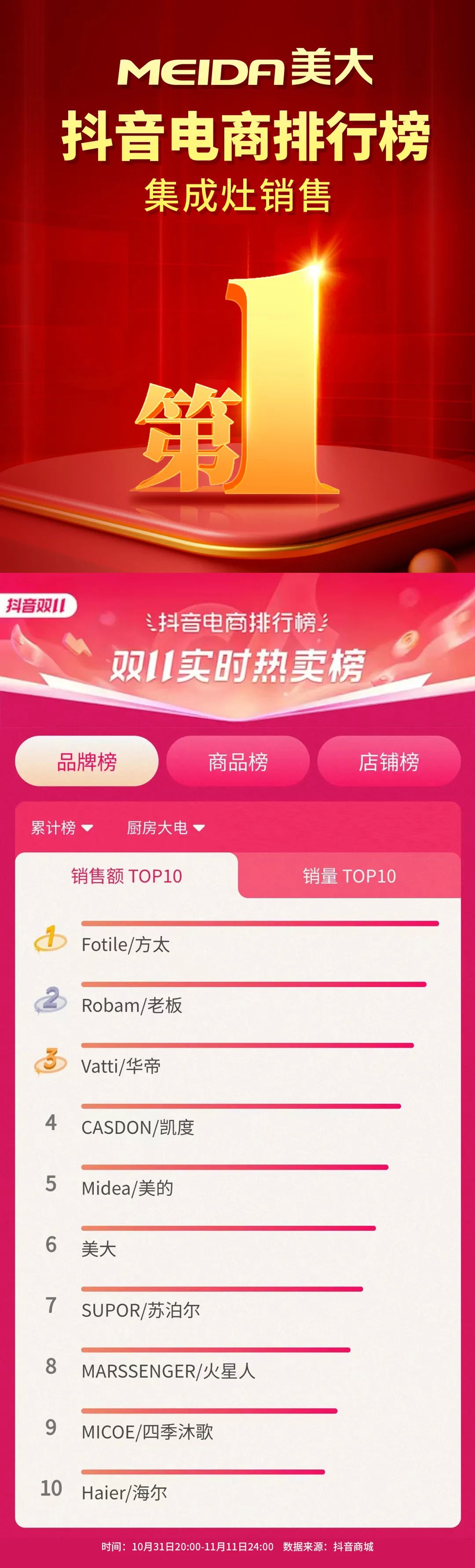 浙江美大順應直播電商趨勢,提前布局直播電商,不斷完善直播運營,美大集成灶官方抖音直播成為抖音商城廚房大電品類的中堅力量。2022年雙11,美大集成灶在抖音商城集成灶品類銷售拔得頭籌,霸榜抖音電商品牌榜、商品榜,既是美大集成灶品牌實力的展現,也是直播電商付出的回報。