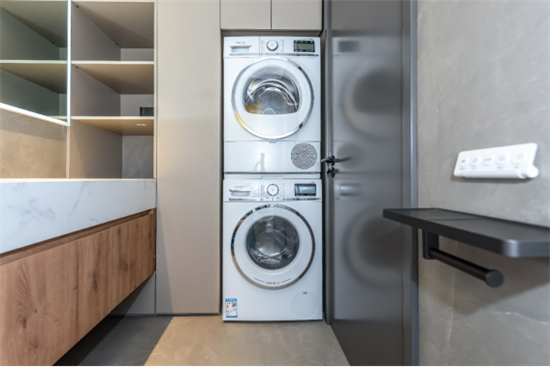 屋主大部分會選擇把洗衣機和干衣機套裝擺放在陽臺或者衛生間。西門子家電推出的歐韻超氧洗干套裝在外觀設計上延續經典歐韻設計,外觀簡潔一體,在不破壞原有家裝美觀度的前提下能夠很好地融入周邊柜體平面,以上下疊放巧妙地隱入家居生態,集成式飛梭程序旋鈕則彰顯專業簡約的設計風格,搭配直徑490mm大視窗方便拿取衣物,流沙金配色盡顯低調奢華。加載的超氧空氣洗和3D立體烘干等創新智能科技可以充分滿足消費者對于高品質的專業洗護需求,從深層潔凈到健康呵護,面面俱到。此外,洗烘套裝可搭配收納功能主題的場景設計,通過定制櫥柜來擴大收納容量,常用的清潔工具、洗漱用品等都可以有序的擺放于此,更加方便日常取用。