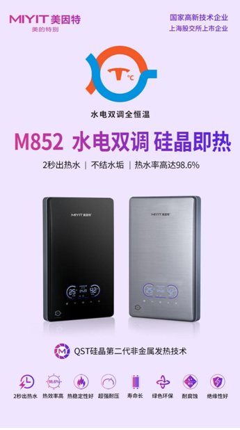 李衛澤介紹,M852采用了QST硅晶加熱技術+水電雙調全恒溫技術的高端組合,產品差異化優勢明顯。水電雙調全恒溫技術提升了恒溫功能與技術,QST硅晶非金屬發熱技術則因為水電分離、不結水垢、2秒出熱水的綜合優勢明顯優異于鑄鋁發熱技術。