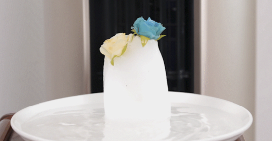 為此,我們此項挑戰用熔點為50℃的石蠟和小花制作了一塊特殊的“雪磚”,將其放置在美的3P風尊柜機的出風口,只要空調的出風口溫度超過50℃且制熱速度夠快,那么石蠟終將熔化。