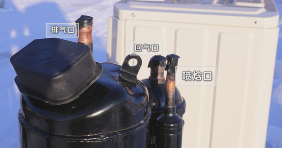 美的工程師給了我們一個(gè)小技巧:“看端口”。普通壓縮機(jī)只有排氣口和回氣口兩個(gè)端口,而噴氣增焓壓縮機(jī)會(huì)多一個(gè)噴焓口。相比采用非噴氣增焓壓縮機(jī)的低壓側(cè)補(bǔ)氣增焓技術(shù),噴氣增焓壓縮機(jī)通過(guò)對(duì)壓縮機(jī)中壓腔進(jìn)行補(bǔ)氣,實(shí)現(xiàn)準(zhǔn)二級(jí)壓縮,進(jìn)一步提高制熱能力。