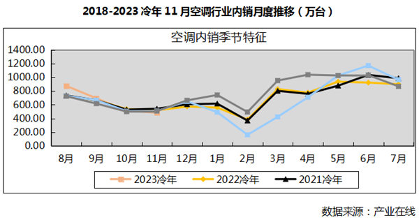 2023冷年累計家用空調生產4150.70萬臺,同比下降2.23%,銷售4040.05萬臺,同比增長0.93%,其中內銷出貨2565.82萬臺,同比增長4.82%,出口1474.23萬臺,同比下降5.19%。