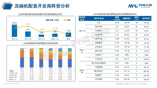 從開發商陣營分析,近幾年隨著頭部房企暴雷,開發商競爭角逐導致排名變化較大,保利發展從去年第四位榮升第一位,廚電精裝房新開盤規模22.14萬套,萬科仍然堅守第二位,廚電精裝房新開盤規模20.35萬套,2家頭部房企以絕對優勢領跑全國。其中華潤置地、建發地產、越秀地產、濱江集團等增速較快,與去年同比分別上升21.4、19.477.0、75.4個百分比。