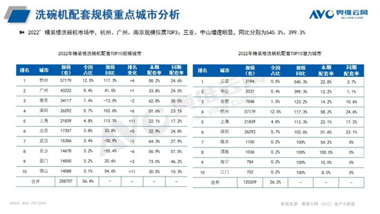 從區域分析,廚電整體精裝市場主要集中在華東、華南,市場份額合計超七成,與去年相比,上升了15.6個百分比;從城市性質分析,主要集中在一線、新一線、二線城市,合計市場份額為87.4%,與去年同期相比,上升8.5個百分比。從單個城市分析,廣州、杭州、成都精裝修廚電市場份額位居TOP3,份額分別為10.3%、7.4%、6.5%,TOP3城市僅廣州堅守。