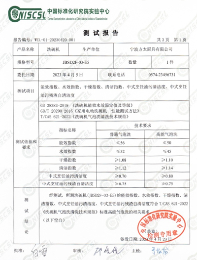 2022年,方太聯(lián)合中國家用電器研究院發(fā)布首個《洗碗機氣泡洗清洗技術規(guī)范》,此次舉辦的媒體溝通會上,方太水槽洗碗機新5系又通過了中國標準化研究院完成技術驗證,經(jīng)由嚴苛的技術測試和實效檢驗,測試結果最終為,能效指數(shù)50、水效指數(shù)45、干燥指數(shù)1.29、清潔指數(shù)1.24、中式烹飪油污清潔度0.87、中式烹飪油污殘渣自清潔度0.77,各項指標均符合要求,其中干燥指數(shù)、清潔指數(shù)均高于國家一級水效標準基數(shù),且對中式烹飪油污的清潔效果顯著。
