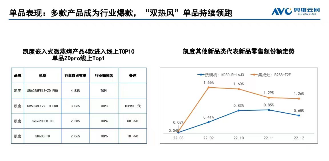 而這樣的創新方式和產品賦能也獲得了消費者的認可。來自奧維云網的數據顯示,2022年線上市場,凱度集成灶和洗碗機同比分別增長了436%和789%。嵌入式微蒸烤產品中有4款進入線上TOP10,SR6028FE13-ZDPRO嵌入式微蒸烤品類線上銷額TOP1,5000元以上嵌入式市場中,凱度銷量第一。