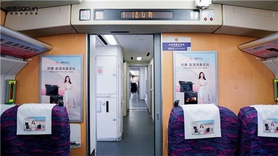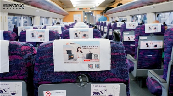 本次帥康與中國高鐵的結合,重點覆蓋滬漢線,從高鐵外車身、車門貼、海報、小桌板、頭枕巾到行李架貼,語音播報和LED顯示屏,傾力打造多維度、立體化傳播矩陣,營造整車品牌氛圍空間,讓乘客近距離感受帥康品牌文化和產品內涵。