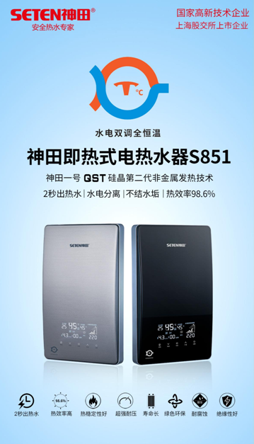 神田S851采用了“雙芯雙核硅晶加熱+水電雙調全恒溫+溜背式亞克力面板+超大屏幕顯示”的設計理念,產品競爭力遠超目前行業內普通的即熱產品。S851的誕生類似于蘋果手機iPhone進入中國市場,iPhone讓智能手機開始普及,S851將會引領行業普及水電雙調全恒溫技術。2023年,即熱式行業很多品牌都加大了類似水電雙調全恒溫技術新品的研發速度。