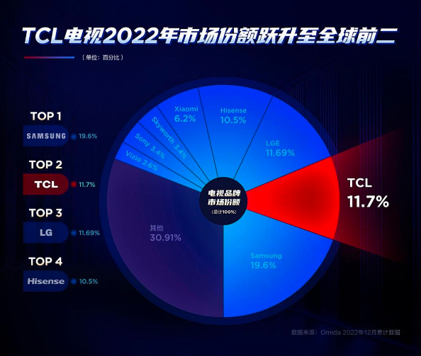 2022年TCL智屏全球出貨量達2378萬臺,同比逆勢增長0.8%,出貨量市占率躍升至全球第二,其中中高端產品TCL Mini LED智屏全球出貨量同比增長26.8%,并且在中國市場零售量以絕對優勢蟬聯市占率第一。