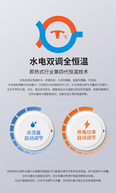 水電雙調全恒溫技術,可以同時自動調節用電功率與水量,無論外界的水溫、水壓、電壓如何變化,都能保證出水溫度達到設定的溫度,恒溫效果更好,水量與水溫也更精準。