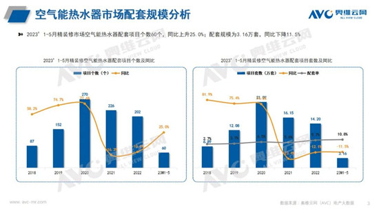 空氣能熱水器:近年來潛力逐步顯露,配置率呈現逐步上升趨勢,2023年1-5月精裝修市場空氣能熱水器配套規模為3.16萬套,同比下降11.5%,配置率達10.8%,同比22年全年上升1.1%;從品牌競爭分析,2023年1-5月精裝修空氣能熱水器市場TOP5品牌的市場份額合計為72.6%,同比上升2.7%,其中海爾上升至TOP1,品牌份額增速最高,同比增長20.6%。戳→奧維數據羅盤