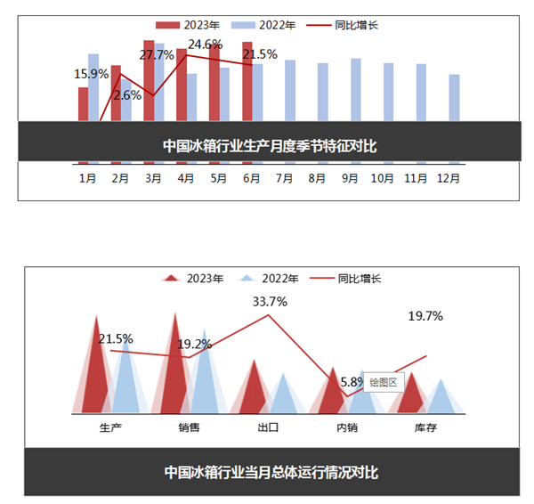 2023年上半年冰箱總生產量為4099.1萬臺,同比增長8.9%。銷售量為4134.2萬臺,同比增長6.1%;其中,內銷量為2048.9萬臺,同比增長4.9%;出口量為2085.3萬臺,同比增長7.2%。