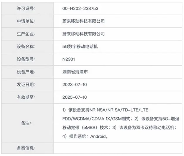 據工信部政務服務平臺,蔚來手機獲工信部進網許可證,設備名稱為5G數字移動電話機,設備產地為湖南湘潭市,型號為N2301,申請單位為蔚來移動科技有限公司,目前暫未公布設備照片。