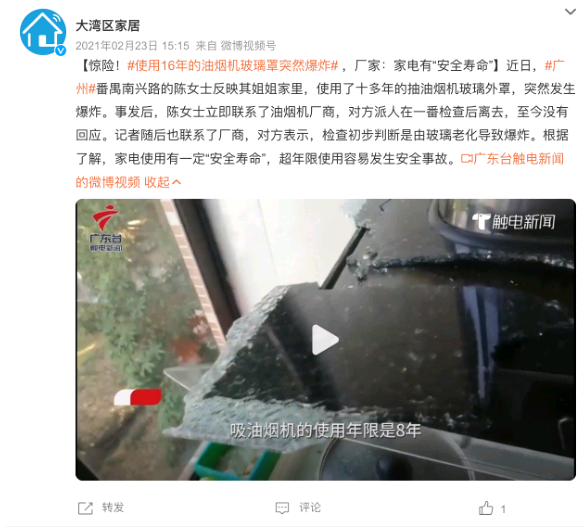 此外,超期服役的家電容易導(dǎo)致漏電、自燃等事故,危害生命財(cái)產(chǎn)安全。此前就曾經(jīng)有新聞報(bào)道過(guò)廣州的陳女士,在廚房做飯的時(shí)候,使用了16年的抽油煙機(jī),由于玻璃外罩老化,突然發(fā)生爆炸,所幸沒(méi)有造成人員傷害,但超期使用家用電器的潛在危險(xiǎn)也可見(jiàn)一斑。