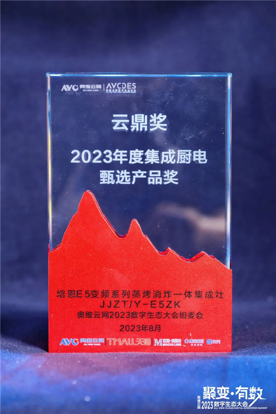 培恩E5ZK蒸烤消炸一體變頻集成灶憑借優越的產品性能,榮獲奧維云網“2023年度集成廚電行業甄選產品獎”。