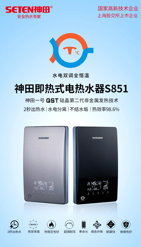 神田一號QST硅晶非金屬發熱技術是神田集團的發明專利,從產品的性能上來講,水電分離,真正安全;不結水垢,在水質差的地區也能正常使用;2秒出熱水,8秒左右就可以達到恒溫效果,熱啟動快,熱效率高。