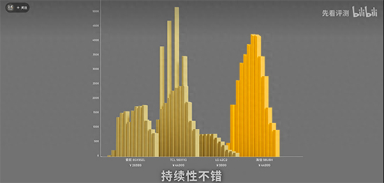 再看TCL X11G,高亮度在2000尼特左右,且持續性有待提升,城市柱狀圖稱“避雷針”式分布。索尼的柱狀圖持續性不錯但亮度較低。