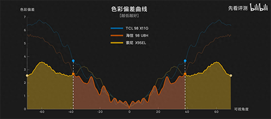 通過色彩偏差的實測,也驗證了這一點。在色彩偏差上,海信電視U8H在小角度下表現最好,超過40°。SONY X955L花大成本覆蓋的可視角度膜效果更優,但缺點也很明顯,那就是削弱電視亮度。