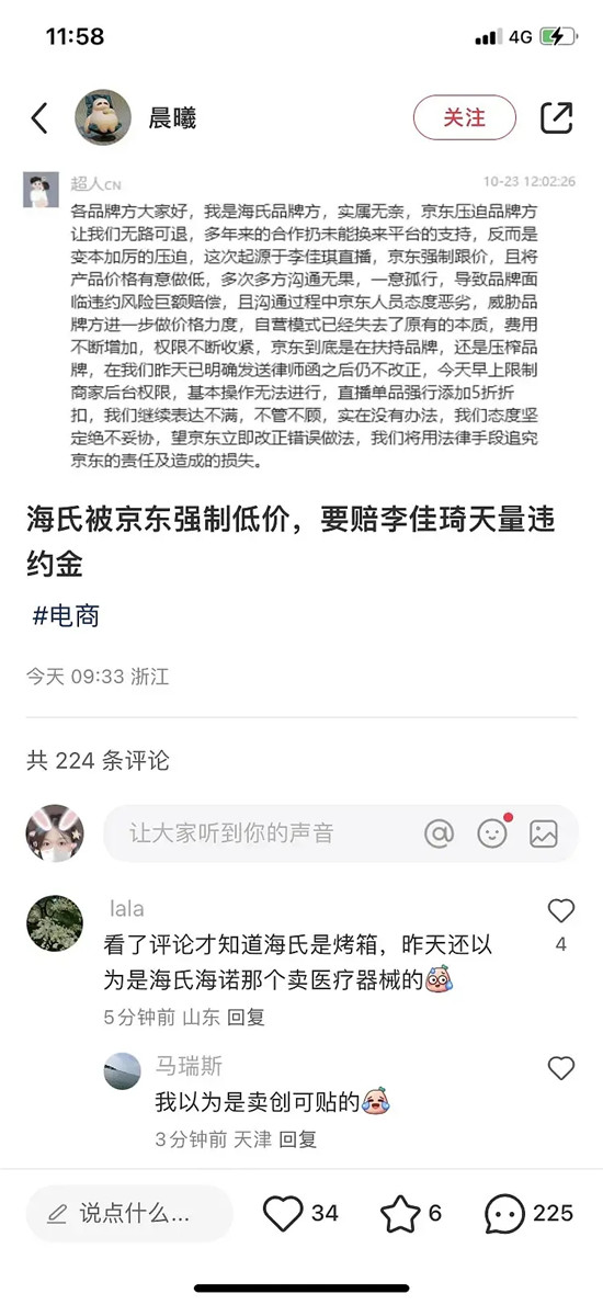 2023年10月24日上午,小紅書上有網友曬出朋友圈截圖。自稱是海氏品牌方的微信用戶“超人CN”發朋友圈稱:海氏與李佳琦達成雙11合作,京東強行跟價,導致京東平臺的某款海氏產品價格低于李佳琦直播間。因而海氏將會面臨來自李佳琦的巨額索賠。對此,海氏要求京東修正錯誤。如果京東一意孤行,海氏在律師函后,還會起訴京東。 海氏相關工作人員的全文矛頭直指京東,但實際上索要巨款的卻是李佳琦。這說明:京東是真實惠!