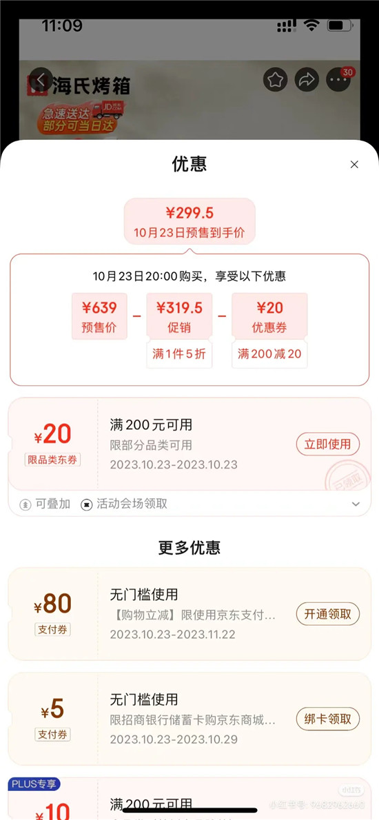 隨即有消費者曬出訂單,訂單顯示,10月23日,在京東的雙11預售活動中,購買海氏品牌烤箱C40,一件5折且可以疊加200-20的東券,最終實付價格為299.5元。
