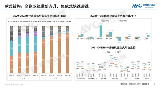 此外,近年來集成洗碗機(jī)受到廣泛關(guān)注,不斷有品牌涌入這一新的集成賽道,集成式快速滲透。據(jù)奧維云網(wǎng)(AVC)監(jiān)測數(shù)據(jù),2023年1-9月,集成洗碗機(jī)線上市場在售品牌數(shù)量達(dá)到110家,與全尺寸嵌入式并列為品牌數(shù)量最多的款式;線上市場零售額占比達(dá)9.8%,較上年同期上漲2.5個百分點(diǎn)。與此同時,集成洗碗機(jī)的均價持續(xù)下降,滲透率有望進(jìn)一步提升。