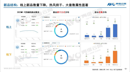 從新品數(shù)量來看,線上新品數(shù)量下降,線下微增。根據(jù)奧維云網(wǎng)(AVC)監(jiān)測數(shù)據(jù),2023年1-9月洗碗機(jī)線上新品數(shù)量199個,同比下降12.1%;線下新品數(shù)量124個,同比增長3.5%。新品烘干方式以熱風(fēng)烘干為主,2023年1-9月線上新品中熱風(fēng)烘干占比64.3%;線下新品中熱風(fēng)烘干占比62.1%。新品套數(shù)主要集中在14套及以上,2023年1-9月線上新品中14套及以上機(jī)型數(shù)量達(dá)95個,線下新品中14套及以上機(jī)型數(shù)量達(dá)64個,占比均在50%以上,且呈上漲趨勢。