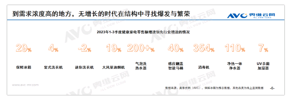 雖然家電市場面臨著需求釋放壓力,但是我們知道市場需求仍在,它不會憑空消失,只是分布不均勻而已。在大盤“無增長”的時期里,想要向市場要增長,那么就要到需求濃度最高的地方去,健康家電便是需求濃度高的細(xì)分市場之一。奧維云網(wǎng)數(shù)據(jù)顯示,今年前三季度保鮮冰箱全渠道同比增長29%,大風(fēng)量油煙機、氣泡洗熱水器、感應(yīng)翻蓋智能馬桶、消毒機、凈熱一體凈水器等品類在線上市場同比增長19%、200%+、40%、354%、110%。