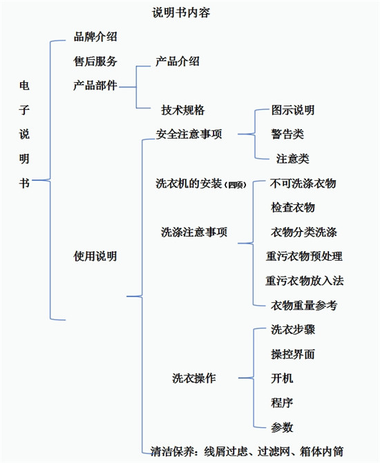 電子說明書分為四個版塊:品牌介紹、產品介紹、使用說明和售后服務;使用說明下面,又分為安全注意事項、洗衣機的安裝、洗滌注意事項、洗衣操作和清潔保養這5個版塊。在這5個板塊中,比較實用的是洗滌注意事項和洗衣操作這個兩個版塊。洗滌注意事項中,分為不可洗滌衣物、檢查衣物、衣物分類洗滌、重污衣物預處理,重污衣物放入法、衣物洗滌重量參考;洗衣操作下由分為洗衣步驟、操控界面、開機、程序、參數等5個小項目。