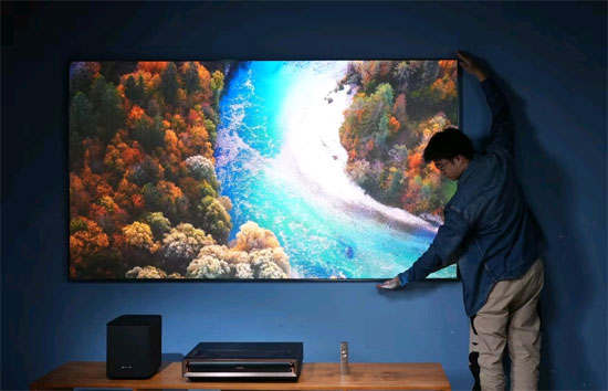 電視畫面想要有“電影感”,首先必須要大,激光電視通過主機投射激光光源到屏幕上成像,越大的屏幕對投射距離的要求也就越高。