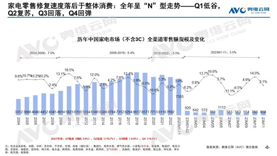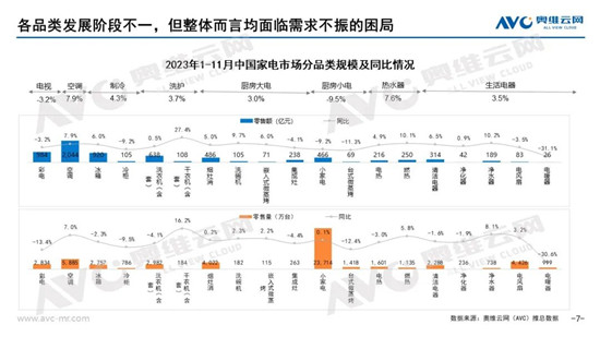 2023年,我國家電零售市場規(guī)模回暖,但整體修復(fù)速度依然落后于社會整體消費。家電零售市場全面呈現(xiàn)出“N型”走勢,即Q1低谷,Q2復(fù)蘇,Q3回落,Q4回彈。奧維云網(wǎng)(AVC)推總數(shù)據(jù)顯示,今年1-11月我國家電市場零售額規(guī)模同比增長3.0個百分點。分品類來看,各品類發(fā)展階段不一,但整體而言仍面臨著需求不足的問題。