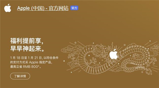1月15日,蘋果官網發布“新春優惠”促銷信息稱,1月18日至1月21日,消費者以符合條件的支付方式購買指定產品,最高可降價800元。