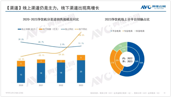 渠道方面,線上市場是凈飲機的主要銷售渠道,市場處于快速發展期,線上同比增長11%,線下渠道快速發展,由于同期低基數的影響,線下市場同比增速超過100%。由于凈飲機的免安裝便捷性、高顏值外觀、凈飲水功能集成、健康等因素,在抖音市場上相較水家電其他品類發展更為快速,抖音電商規模占線上比例達到15%。