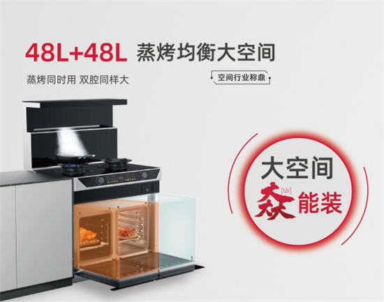 蒸烤均衡款,48L純蒸空間+48L單烤空間,蒸烤均衡,獨立操控,雙腔各司其職,蒸烤可以同時進行。40cm進深,四層擱架設計,可以實現一次性蒸烤多道菜肴,15分鐘完成一頓大餐不是難事,輕松應對家宴和聚會,而且獨立的蒸烤空間也不會出現蒸烤串味的情況。