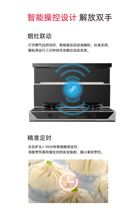 智能操控設計,可自由實現揮手智控、煙灶聯動、1-99分鐘智能精準定時,解放雙手的同時,也可以消除烹飪期間的安全隱患。