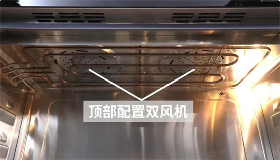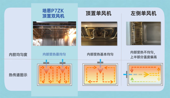 要想烘焙、燒烤的出品賣相好、不翻車,蒸烤箱風機設計合理是關鍵。對比頂置單風機和側置風機,培恩P7ZK的頂置雙風機,能將頂部熱管的熱量更均勻地帶到內腔各個角落,實現恒溫加熱。