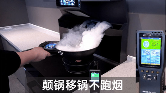 是否搭載性能強、噪音低的變頻電機,是劃分高端煙機和普通煙機的分水嶺。搭載變頻電機的培恩P7ZK,爆炒風量可達23m³/min,足以應付家常爆炒排煙。實測排煙迅速不跑煙,一旁的空氣質量檢測儀顯示PM2.5、PM10等油煙污染物,始終維持在較低水平。