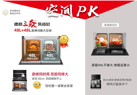 縱觀市面上大部分的蒸烤獨立型集成灶,都是簡單將蒸烤箱一分為二,左右大小不一致、容量小,如果家里聚會人多,就很難滿足烹飪需求。領航者系列蒸烤均衡款因其模塊化結構+獨創的上置直排風道系統,釋放了更大的空間,也造就了48L純蒸空間+48L單烤空間的超大空間,雙腔同樣大,40cm進深,四層擱架設計,蒸烤容量行業第一。