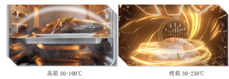 蒸烤均衡款蒸烤盤互聯互通,各內置了8大智能模式,可以自動調節火候、溫度、熱曲線、時間等,±1℃精準控溫,30-230℃寬域調溫,可以最大程度展現食材的色香味形,烤得更鮮嫩,蒸得更營養,炸得更健康。