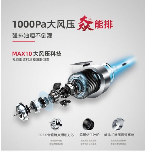 蒸烤均衡集成灶還搭載了德意獨創的MAX10大風壓科技,最大風壓可達1000Pa,感知煙道壓力智能調節風壓,徹底杜絕煙道擁堵和油煙倒灌。獨創上置直排風道,爆炒風量達到20m³/min。創新power大火力燃燒系統,實現5.2kW強勁、持久大火力,暢享中式爆炒。