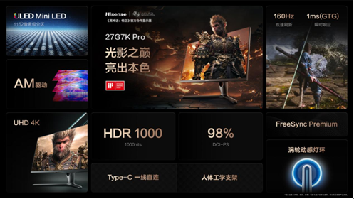 游戲科學公司制作的游戲《黑神話:悟空》是關(guān)注度極高的單主機游戲大作,它用世界級制作標準深度講述中國本土神話故事,精良質(zhì)感和濃厚的中國元素,吸引了全球游戲玩家關(guān)注。海信視像作為擁有53年畫質(zhì)調(diào)校實力的顯示企業(yè),成為《黑神話:悟空》的官方全球合作伙伴。為使每一抹濃郁中式色彩都能得到原汁原味的體現(xiàn),海信顯示器27G7K Pro采用海信特有的ULED Mini-LED技術(shù),以及海信自研Local dimming控光算法對畫面色準、對比度、清晰度等進行定制調(diào)教,對游戲畫面質(zhì)感精準還原。