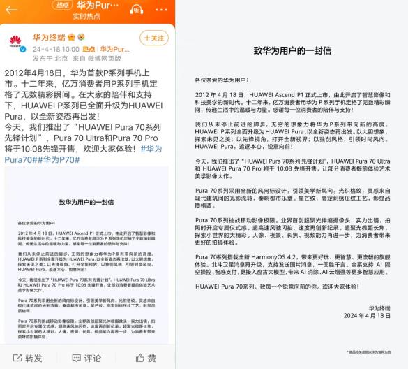 4月15日,微博號“華為終端”發布短片,正文中稱:“HUAWEI P系列升級為HUAWEI Pura,以全新姿態,再出發!”早在2019年,華為就申請注冊了"Pura"和"HUAWEI Pura"的商標,醞釀為P系列更名。據了解,"Pura"是一個西班牙語單詞,含義為"純粹的""完美的",符合P系列的高端定位。
