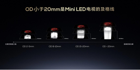 我們都知道當光傳播的距離越遠時其擴散角度就越大,同理,對于Mini LED電視來說,OD值越大,光線擴散角度就越大,在同樣分區數量下,就更容易溢出分區范圍,進而產生光暈現象,影響畫質表現,同時過大的OD值也會讓電視變厚。按業界標準,Mini LED電視的OD小于20mm是及格線,OD值越小,光暈控制能力越強,電視越薄。