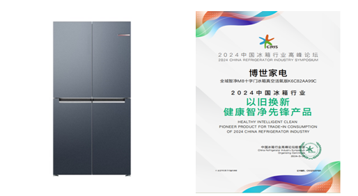 博世全域智凈M8真空活氧版十字門KC82AA99C冰箱榮獲2024中國冰箱行業以舊換新健康智凈先鋒產品獎