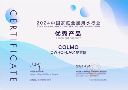 在2024中國家庭全屋用水行業高峰論壇上,CWHO-LA61直飲機摘獲“2024中國家庭全屋用水行業優秀產品”獎,再次印證了COLMO在凈水行業中的技術引領和創新實力。