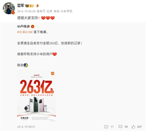 小米618全渠道累計支付金額突破263億元,刷新了小米歷年大促記錄。