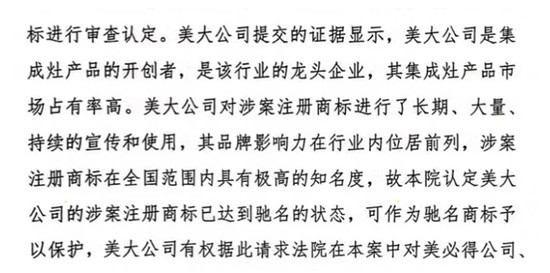 法院在判決書中載明,美大公司是集成灶行業(yè)開創(chuàng)者和龍頭企業(yè),市場(chǎng)占有率高,在全國范圍內(nèi)具有極高知名度,美大公司的行業(yè)地位、品牌價(jià)值和品牌影響力已經(jīng)通過司法判決得到了充分的、權(quán)威的肯定。