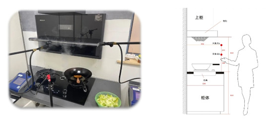 4.彌散濃度(烹飪污染物)/dispersion concentration(cooking pollutant):食物烹飪、加工過程中揮發的細顆粒物、油煙、氣態污染物及其,產物濃度的總和(本底濃度基礎上的增量值),以烹飪操作人員的呼吸區域測得的PM2.5為標志指示物,單位為μg/m³。家庭廚房烹飪污染物在高溫烹飪時在灶具周邊空間彌散的濃度,數值越低,污染物被人體吸入的量越少。