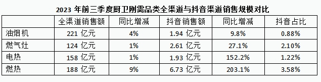 乍一對比,煙、灶、電熱、燃熱在抖音平臺的增速驚為天人,實際上,兩相對比之下,才會發現,抖音的高增長的基礎是低占比,過低的占比讓其表現在大盤無足輕重,想要用抖音的銷售額影響大盤,無疑是螳臂當車、蚍蜉撼樹。